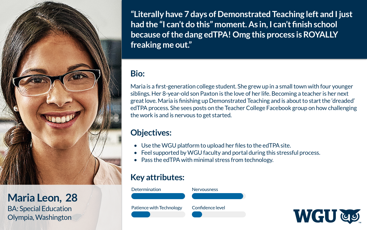 To build this persona I utilized our Teacher College Facebook group for the quote, attributes, and bio, data on student age, location, and degree and stakeholder goals for the objectives. If this product had the time to do proper research, I would have surveyed and interviewed students.